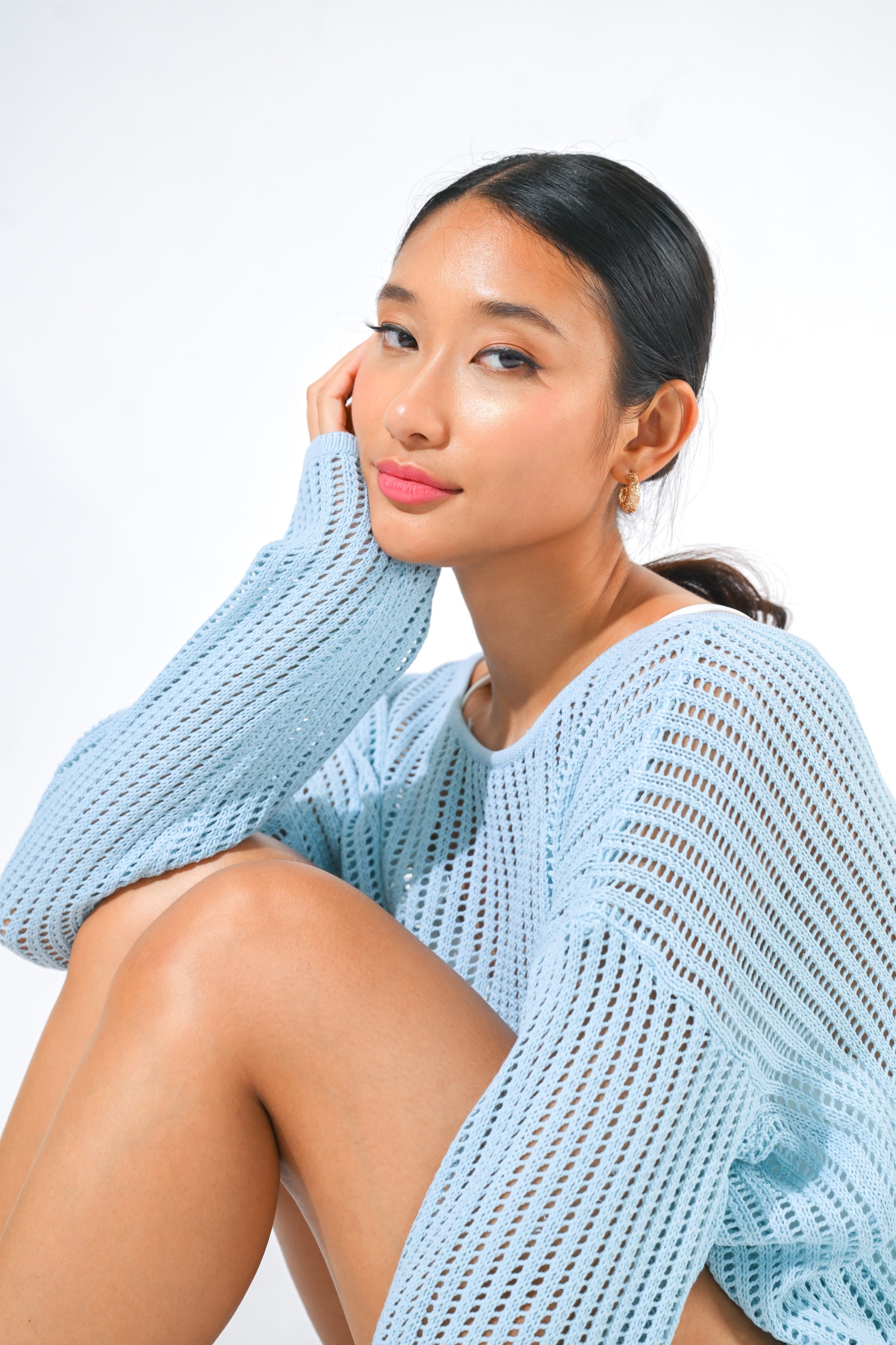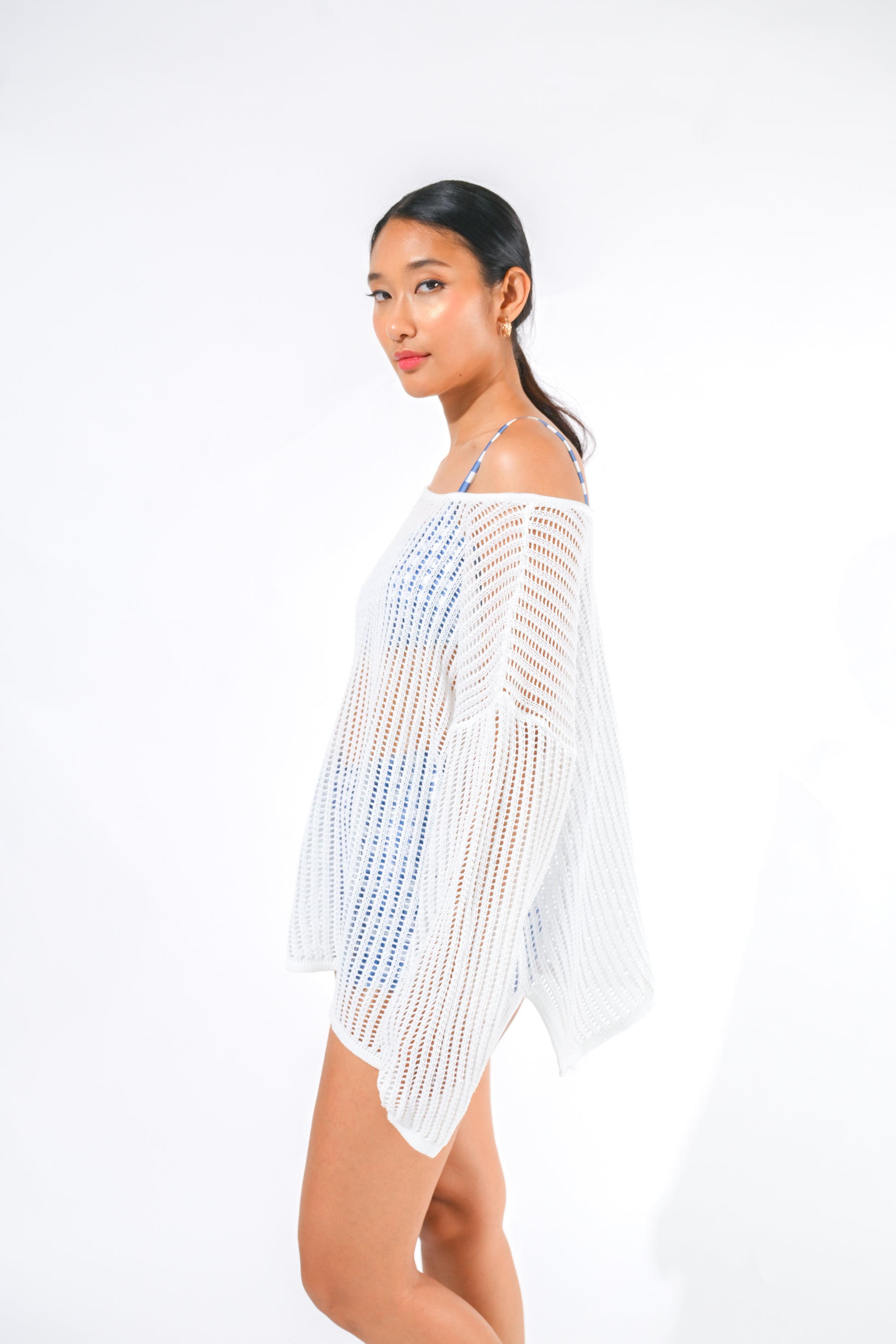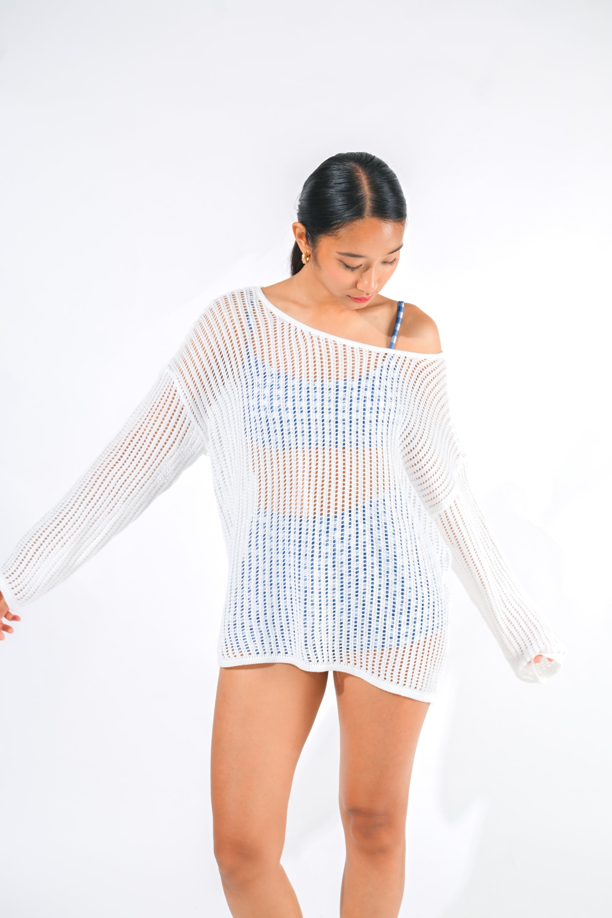 Long-sleeve oversized knit top. This can be worn as a casual top or as a cover-up.