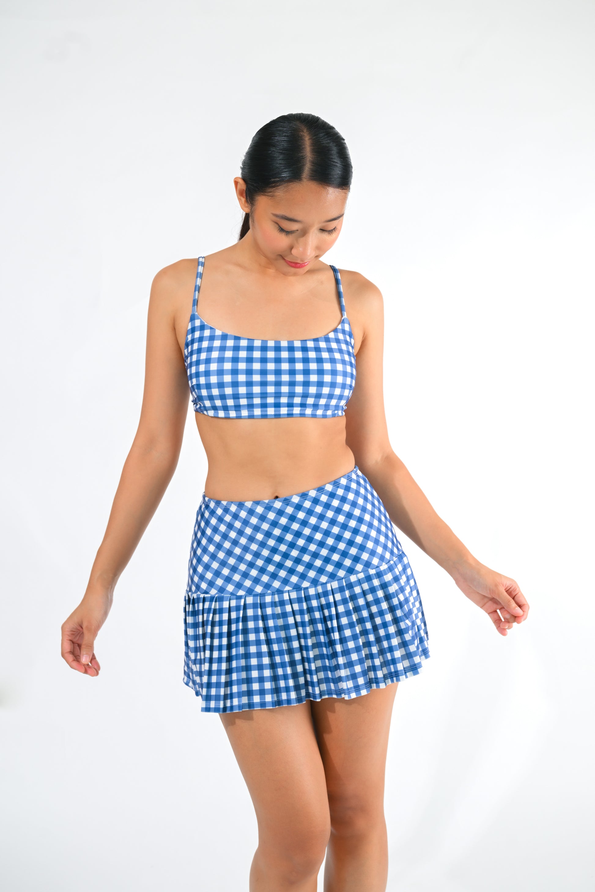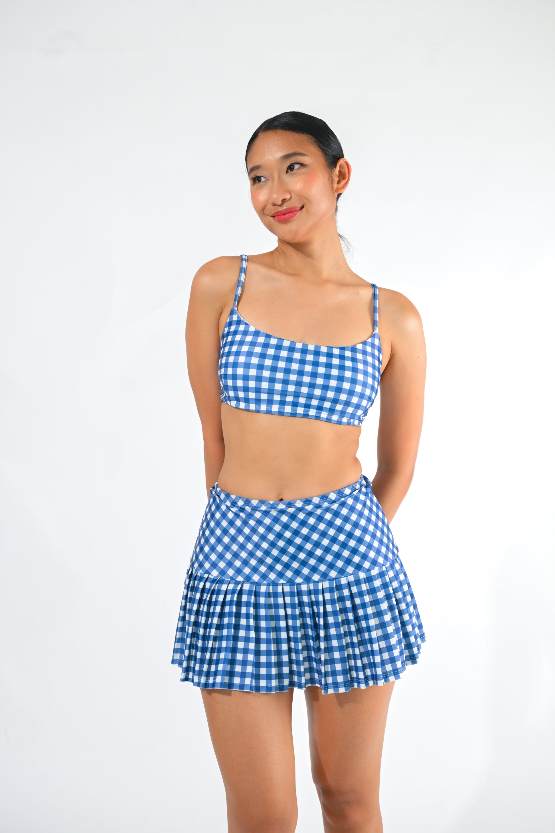 The ALICE is a two piece swimsuit with a scoop-neck top and high-waisted pleated skort.
