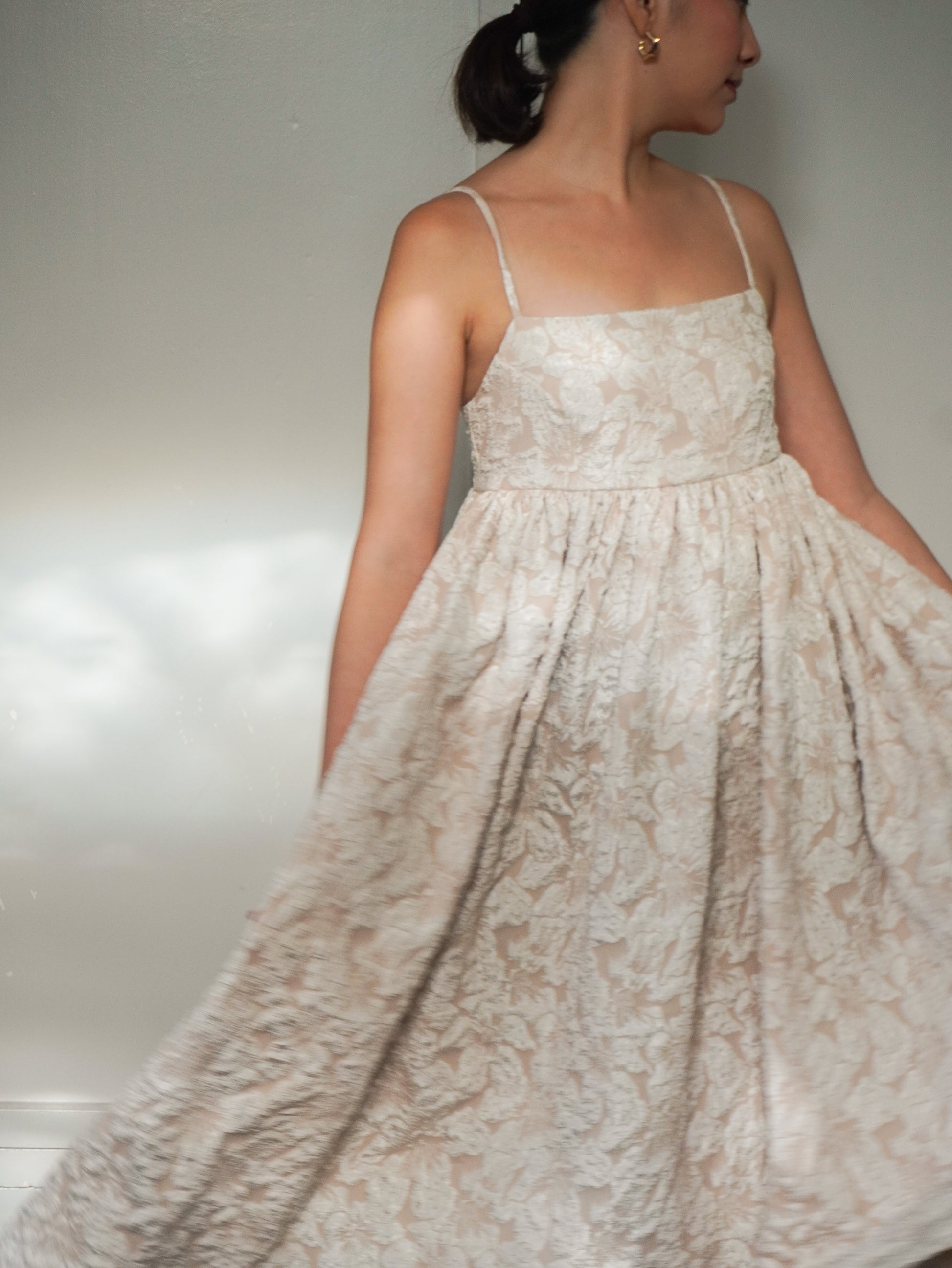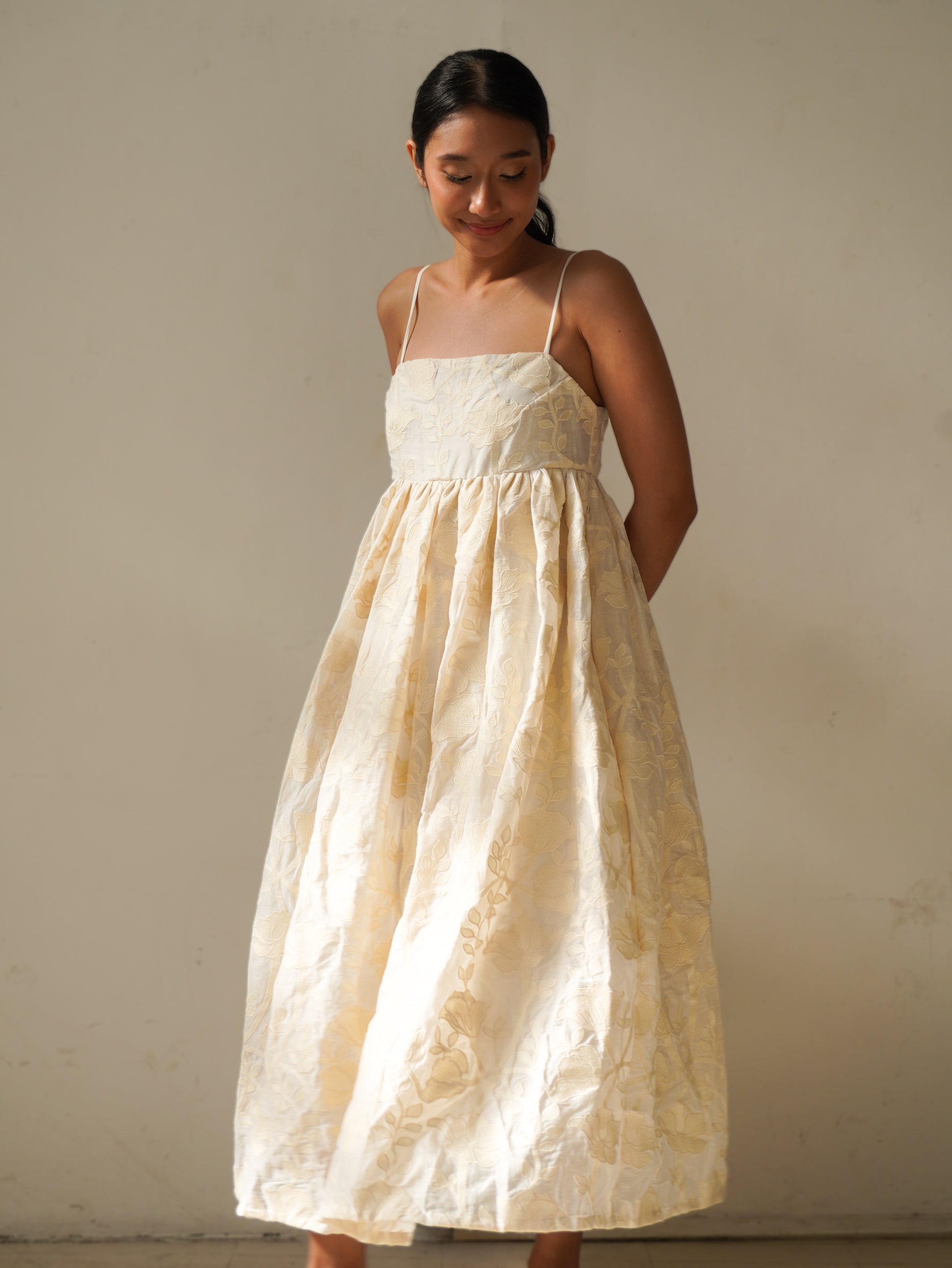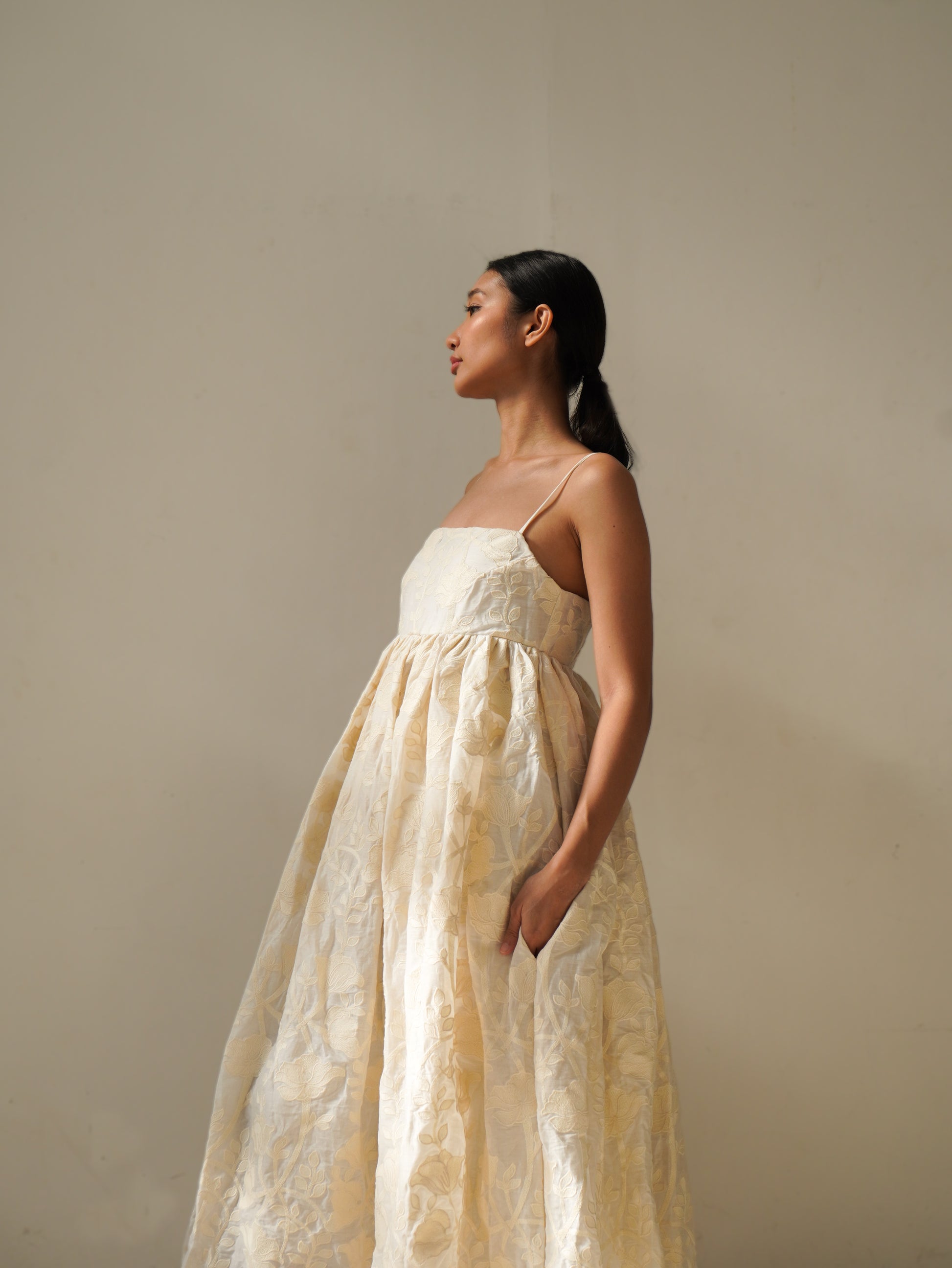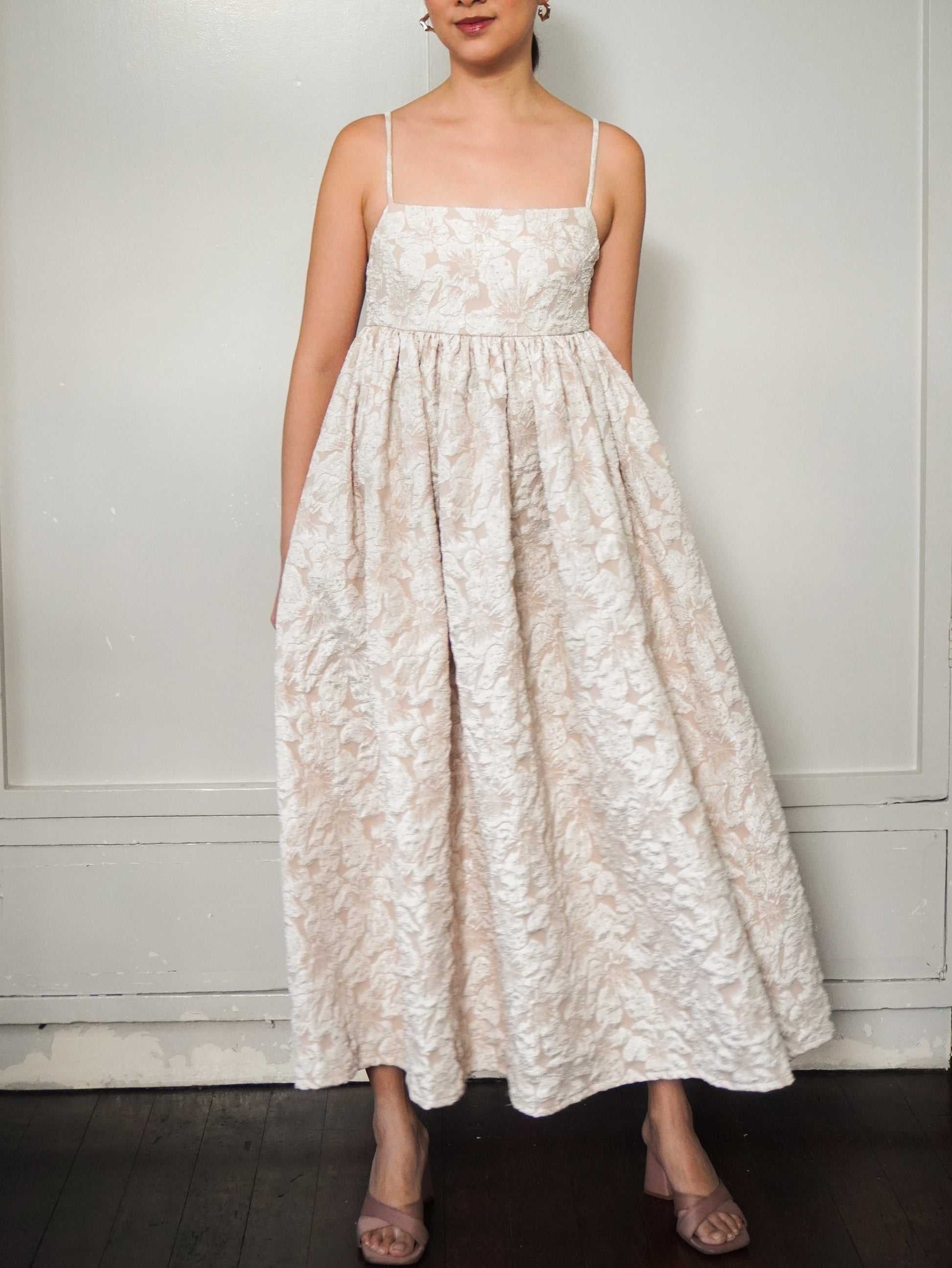 STYLE: An elegant empire-cut maxi dress with spaghetti straps in cream lace. Demure, yet holiday-feasting friendly. Feel comfortable throughout the festivities this holiday season.