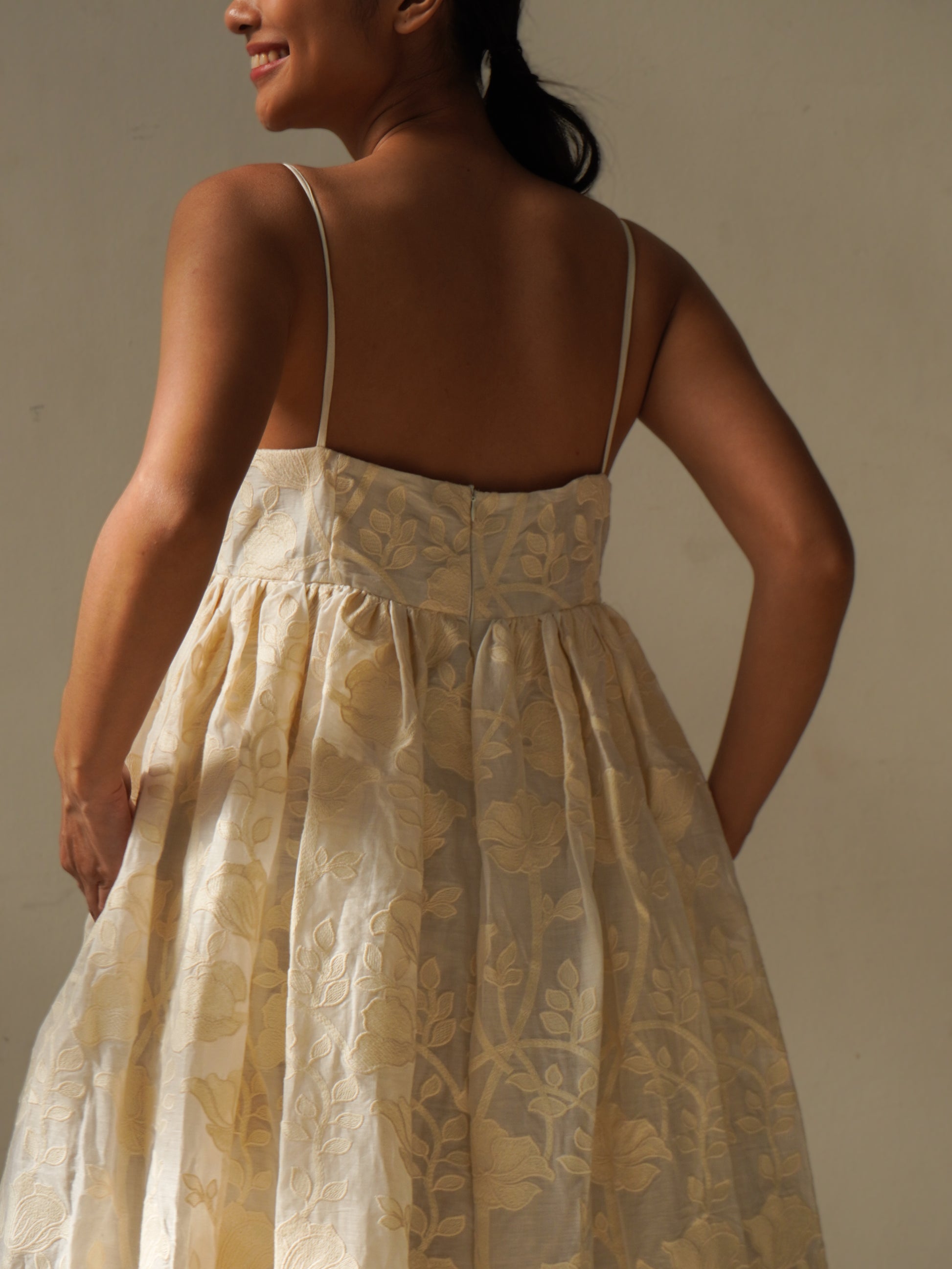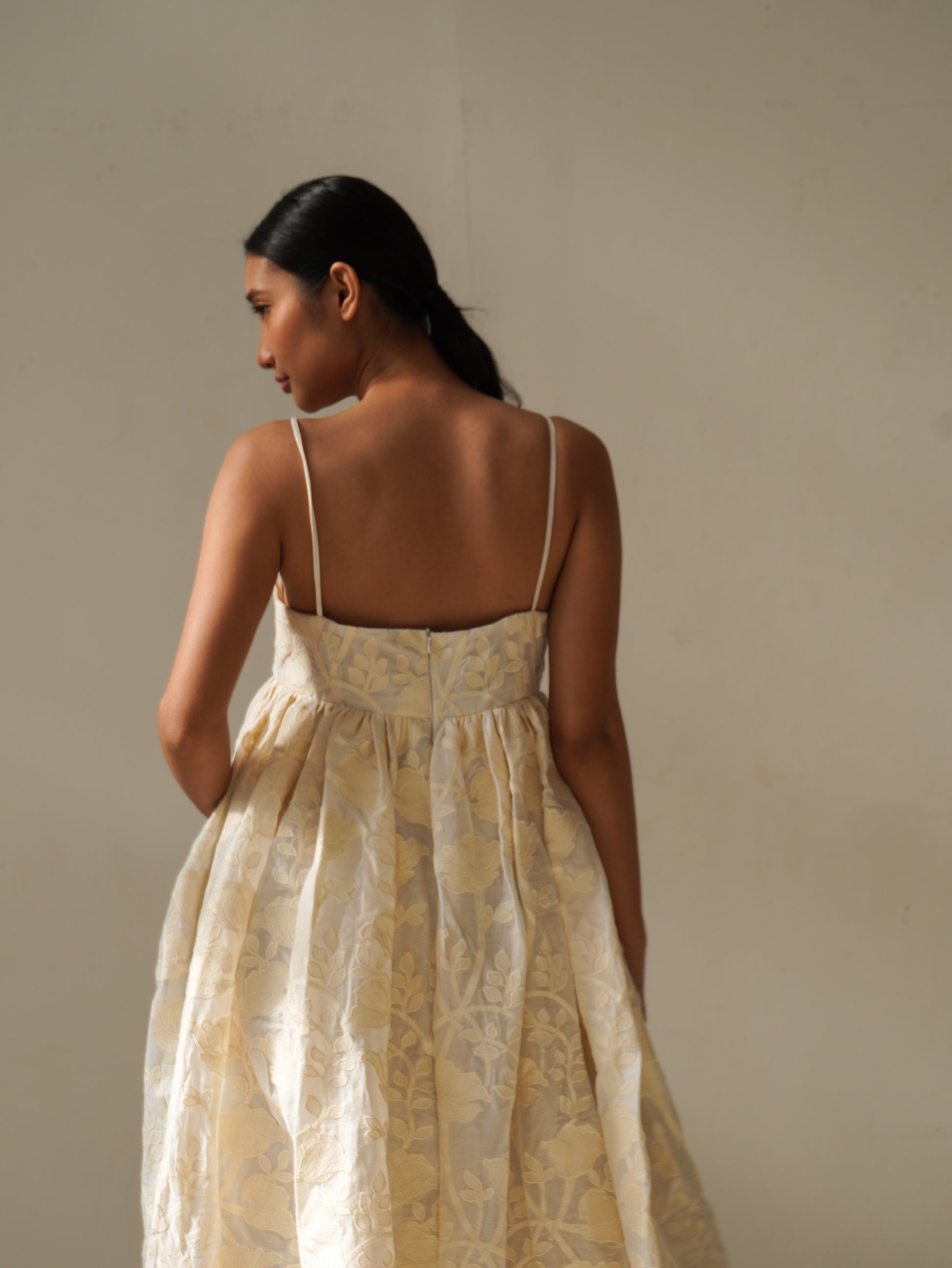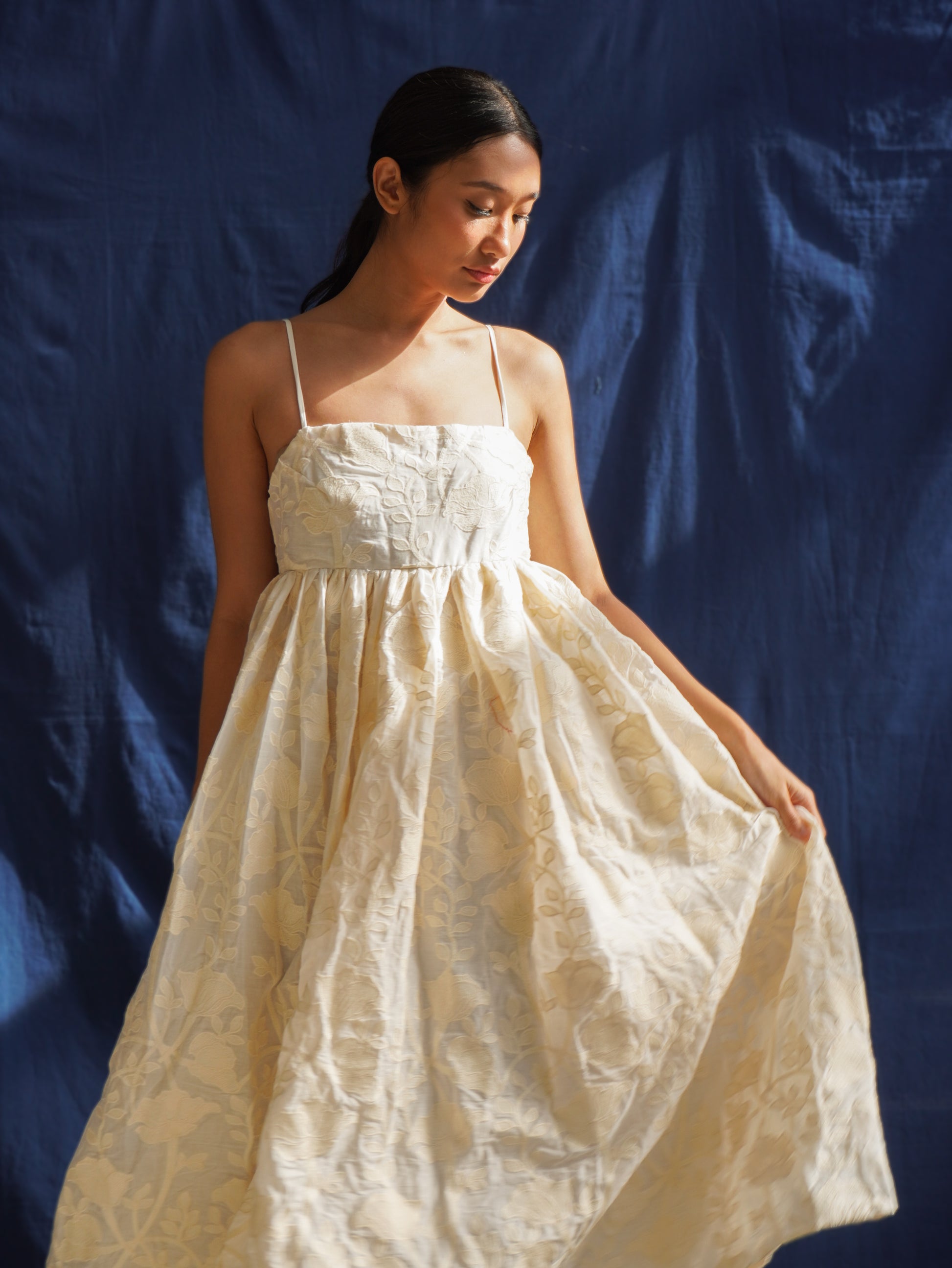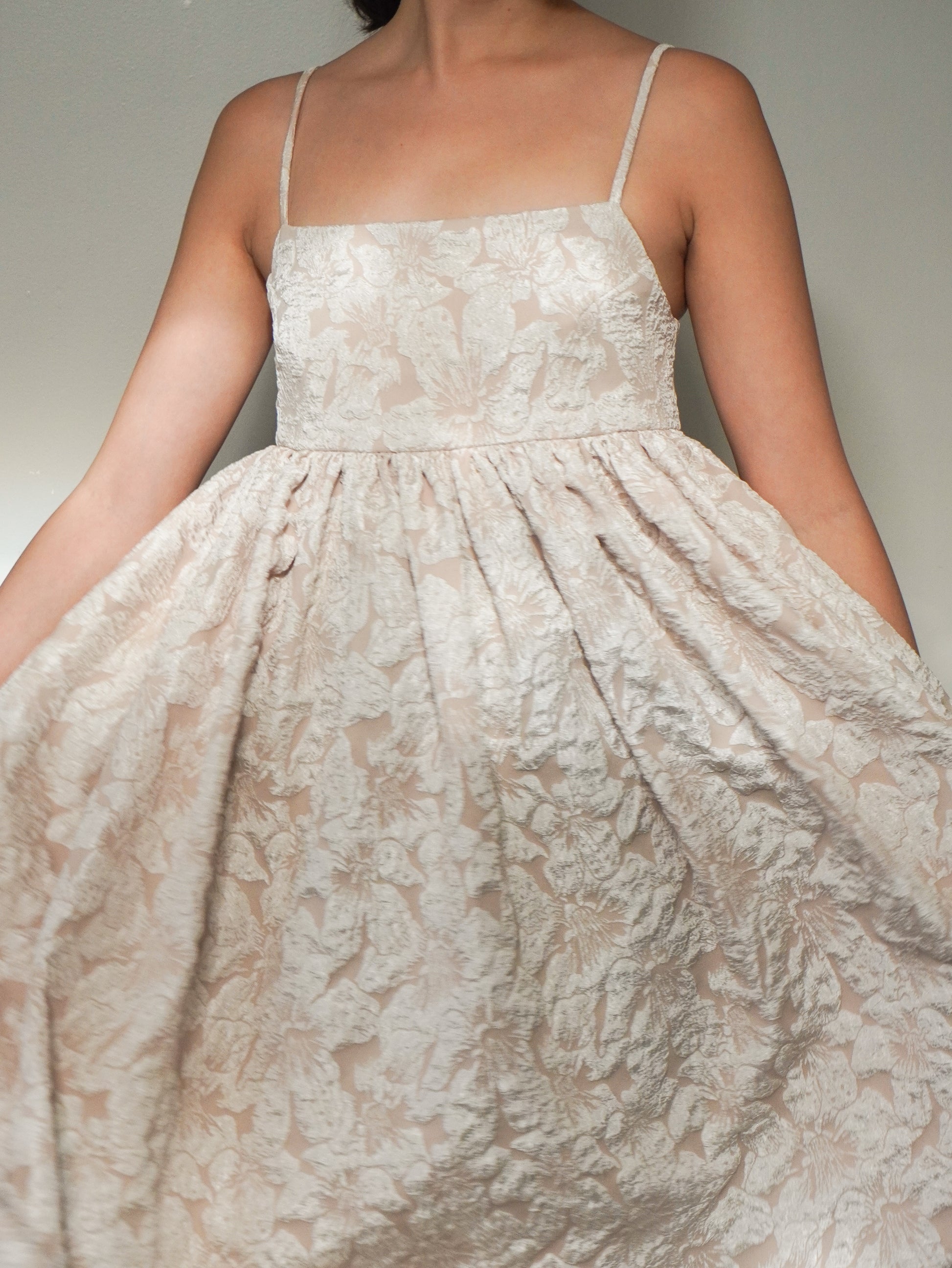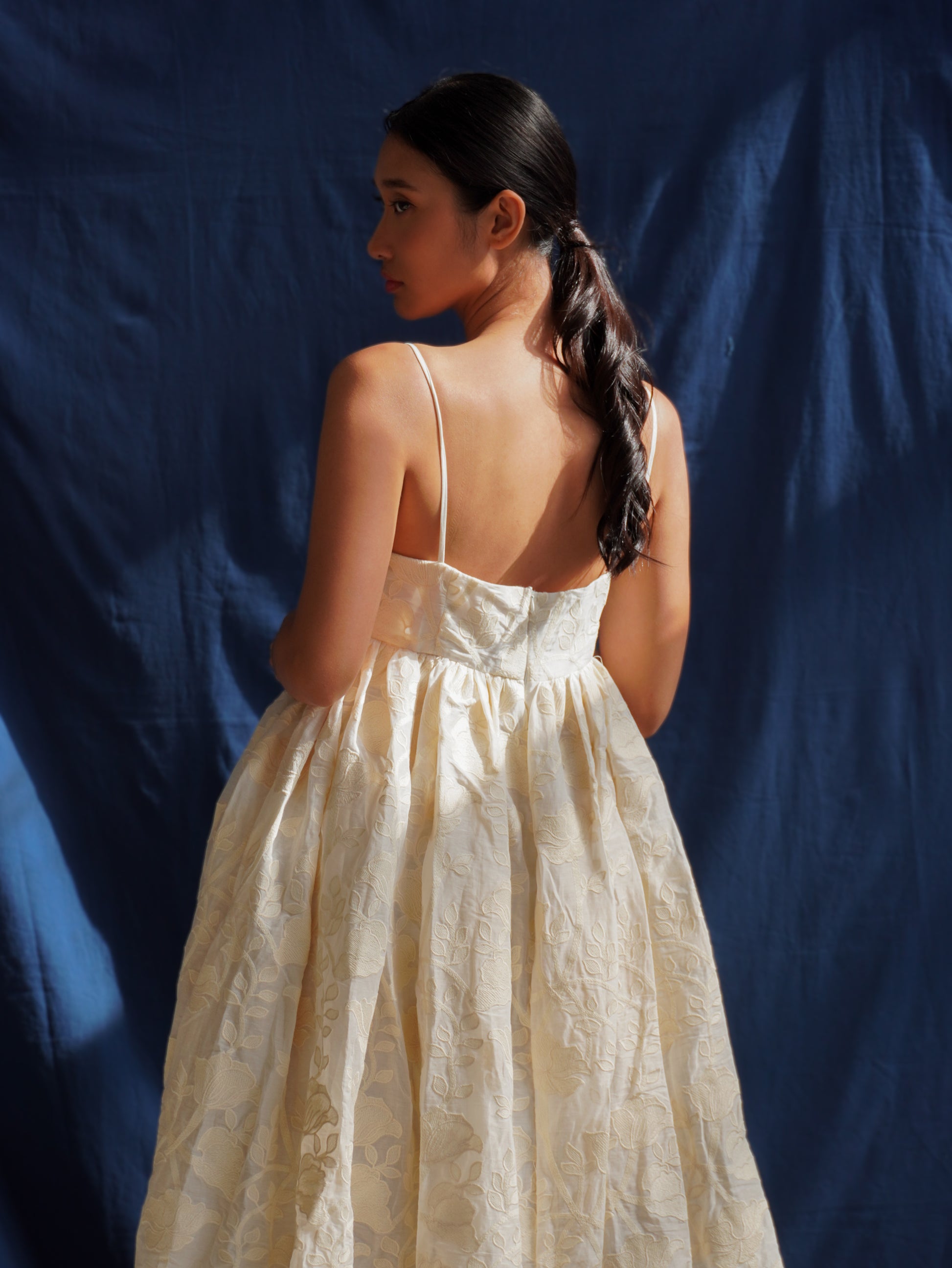 STYLE: An elegant empire-cut maxi dress with spaghetti straps in cream lace. Demure, yet holiday-feasting friendly. Feel comfortable throughout the festivities this holiday season.