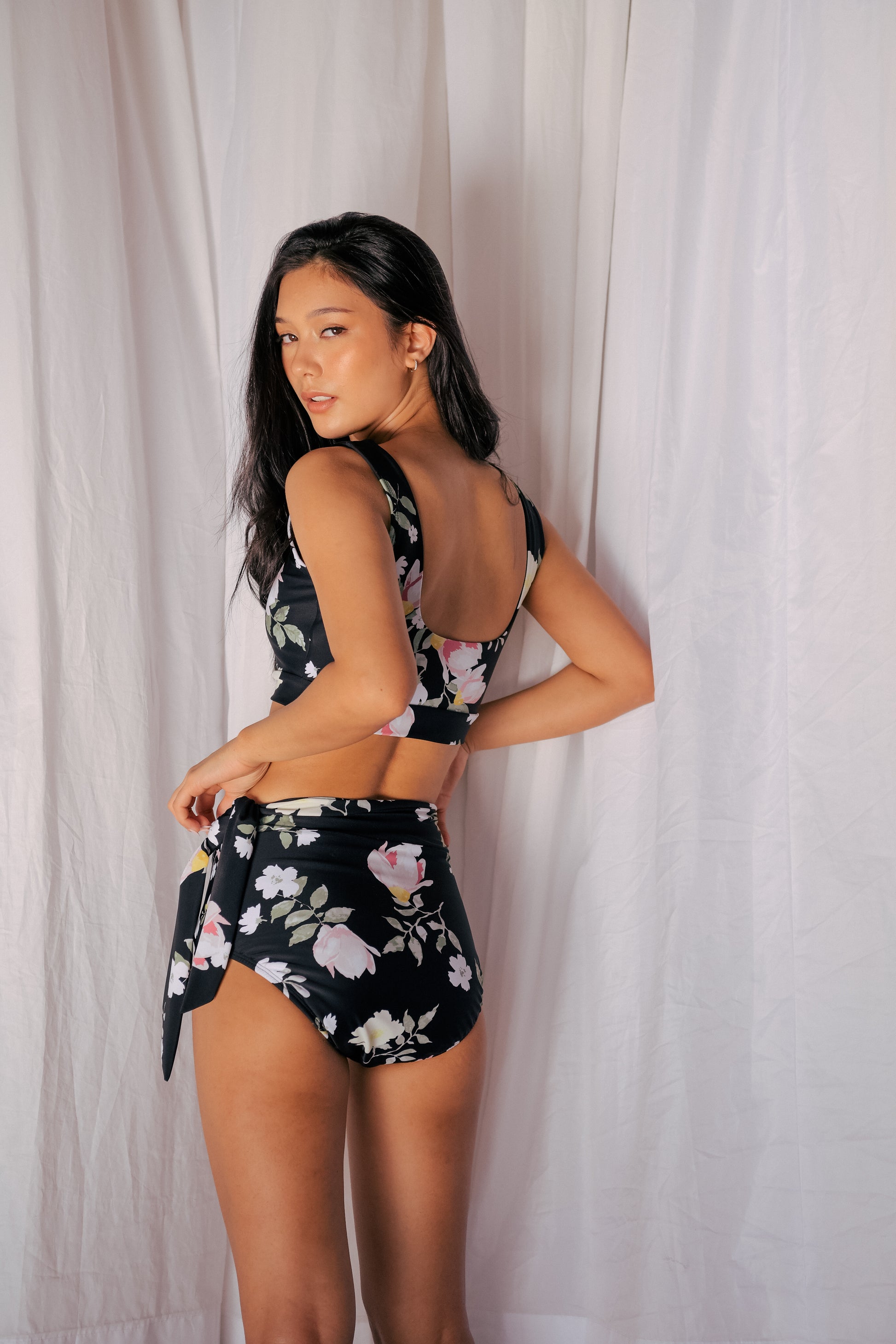 STYLE: Two-piece swimsuit with scoop-neck top and high-waist bottom with tie sash.