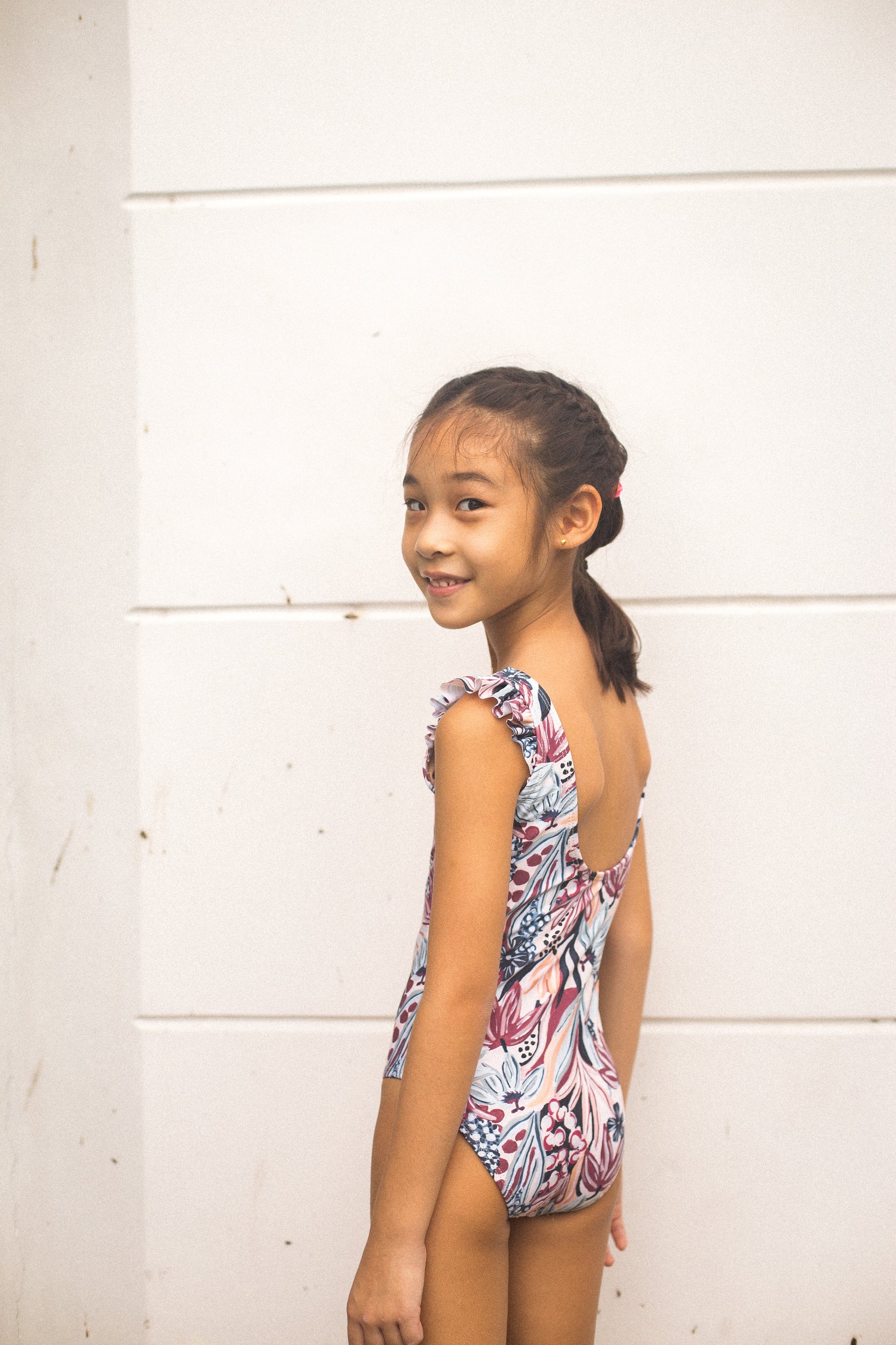 STYLE: Kids one-piece swimsuit with ruffled shoulder.