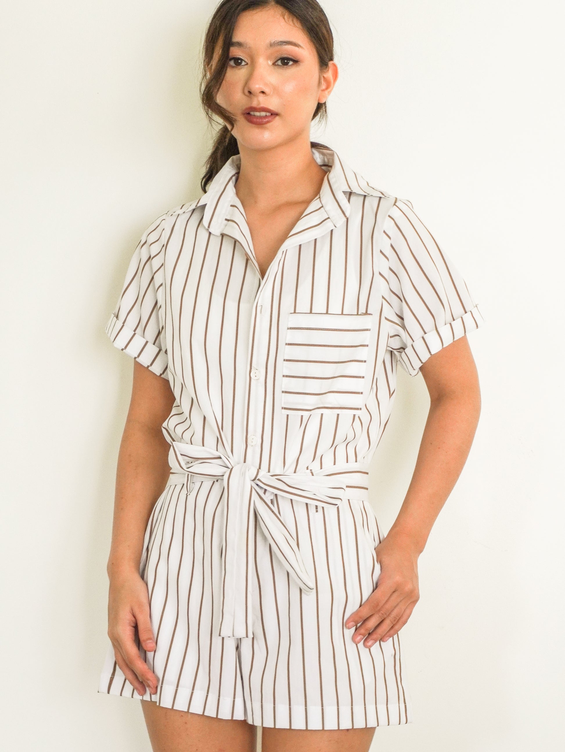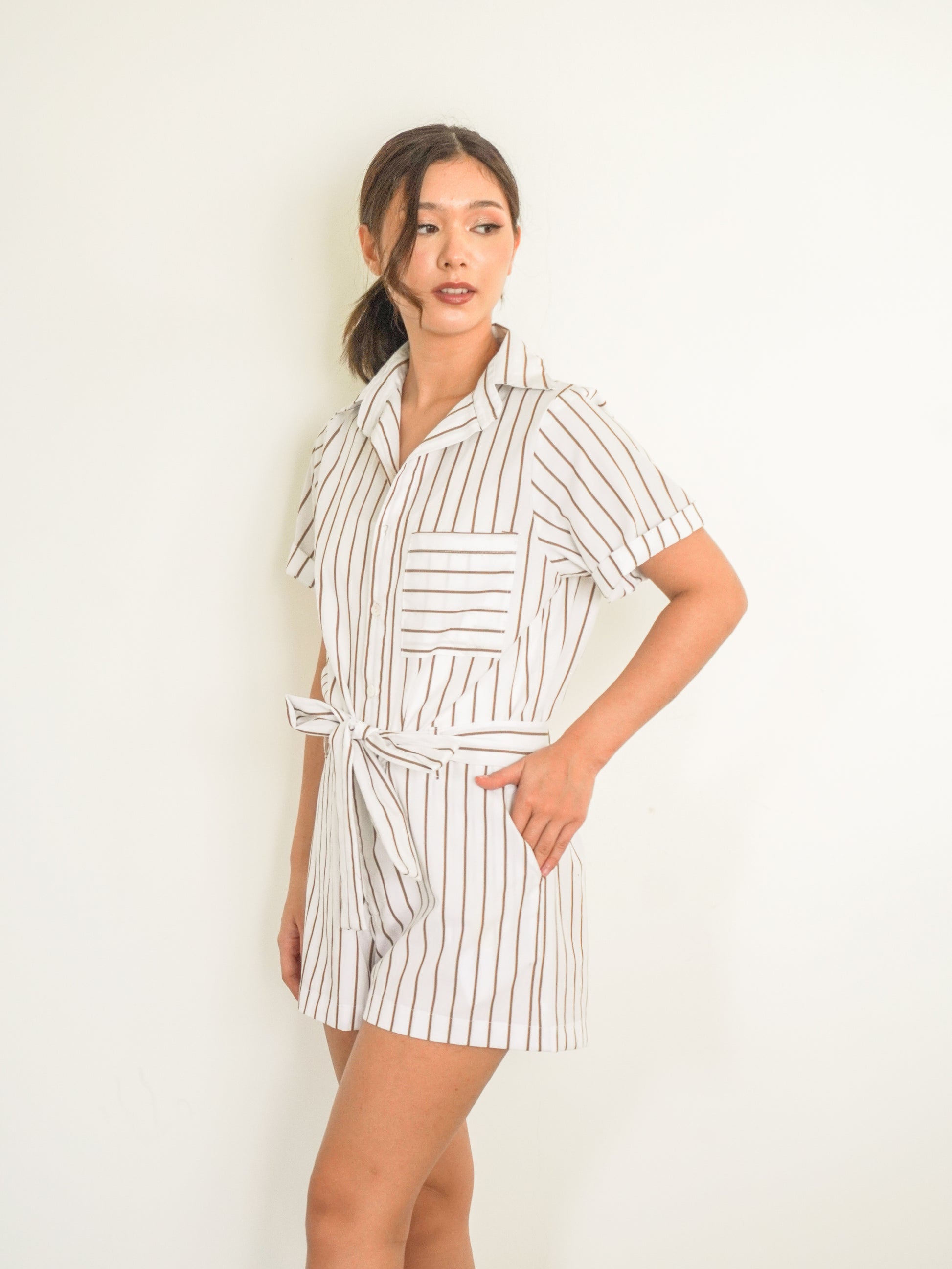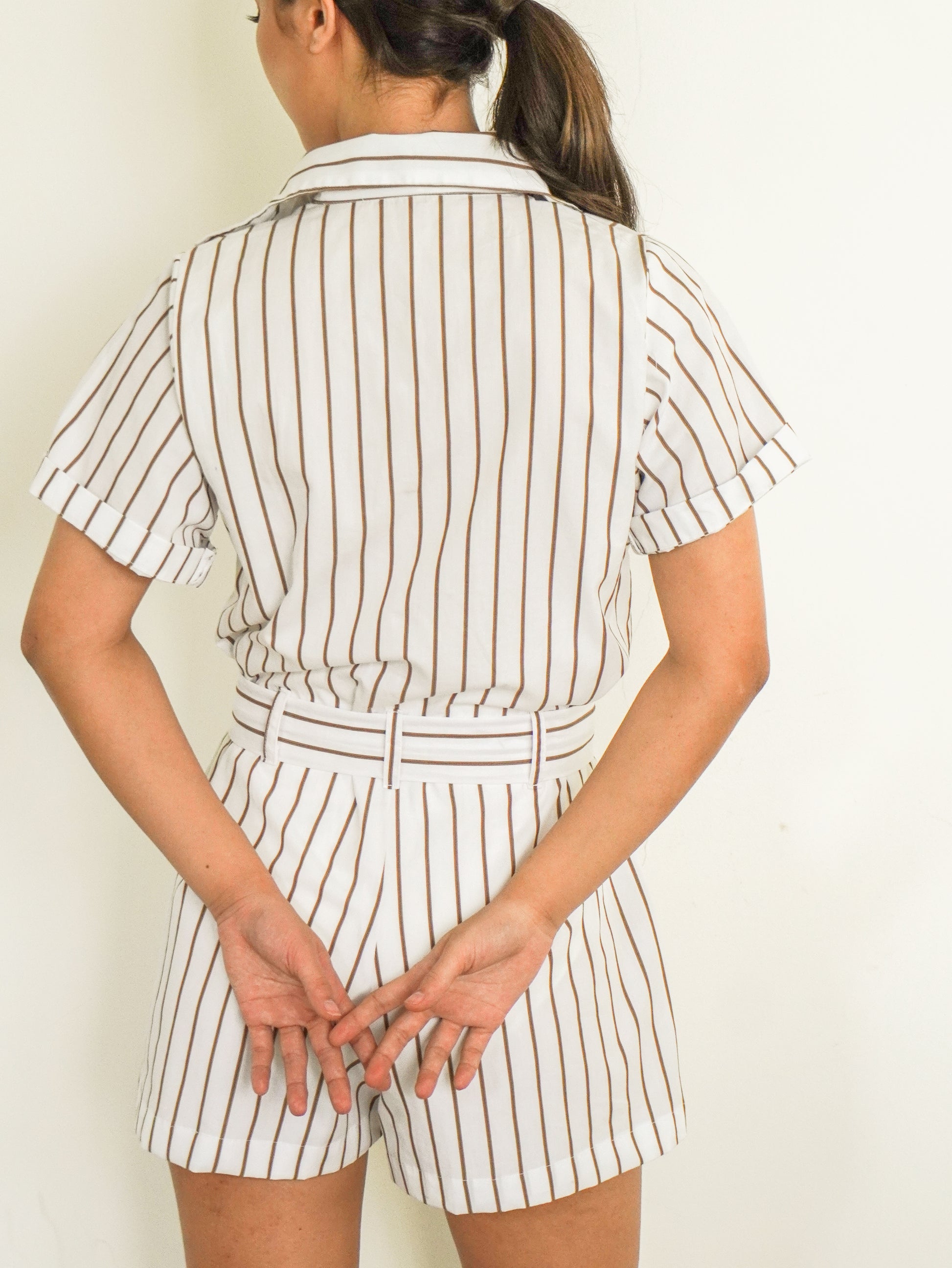 DESCRIPTION: Collared button-down playsuit with removable belt.