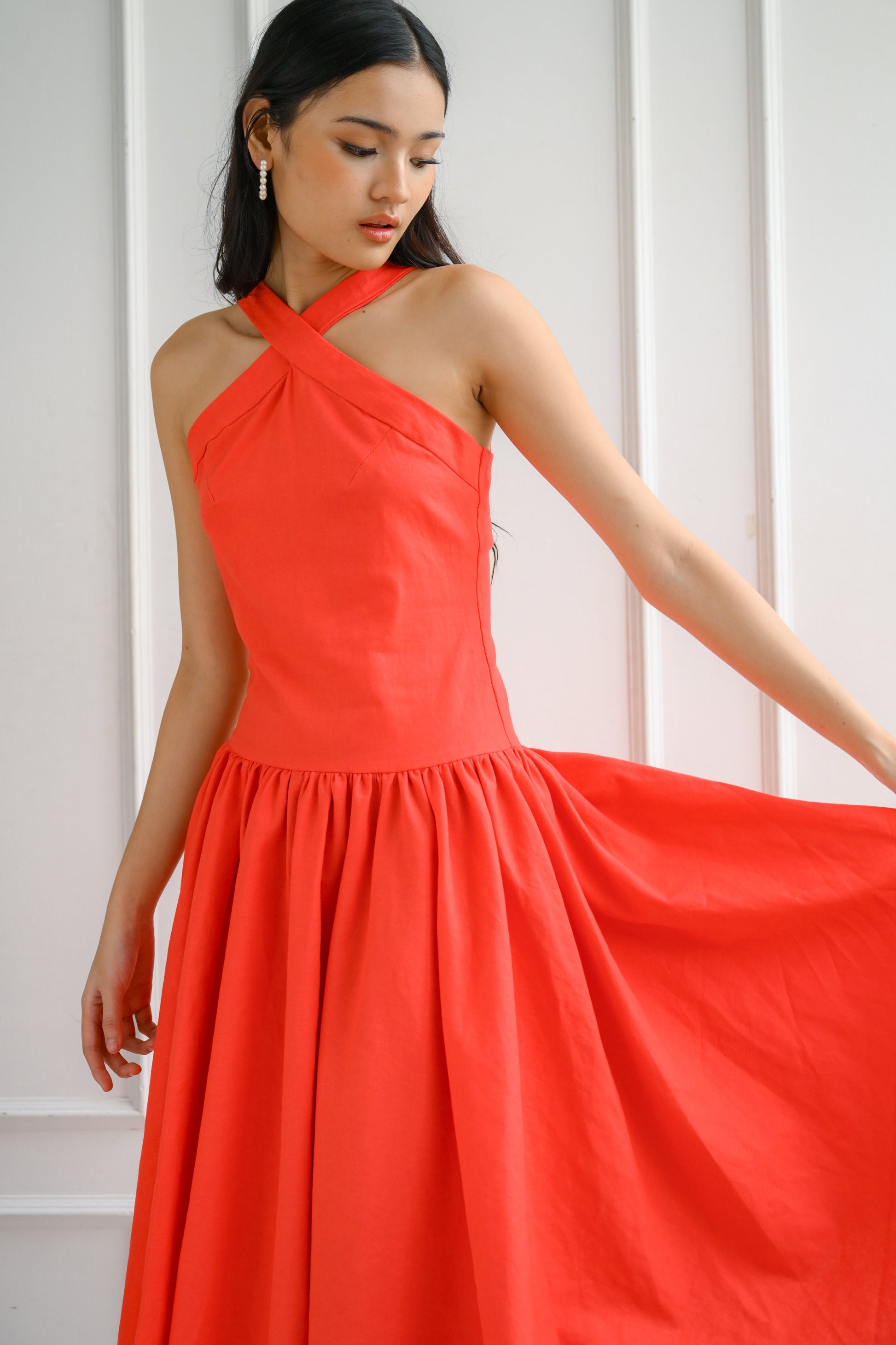 DESCRIPTION: The cross halter neckline frames the collarbone and shoulders, while the tailored bodices cinches the waist. The skirt creates a polished look making it a festive dress that can be taken from day to night.