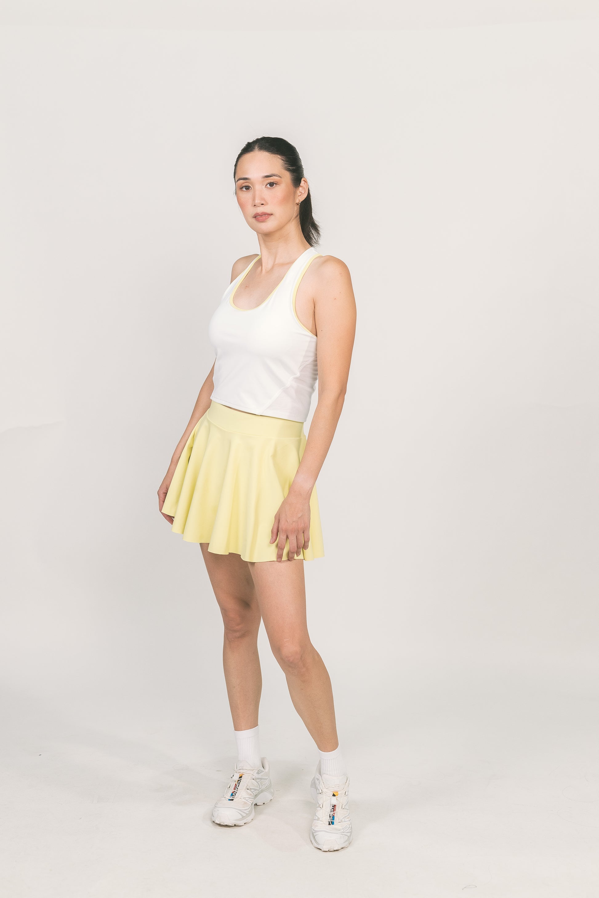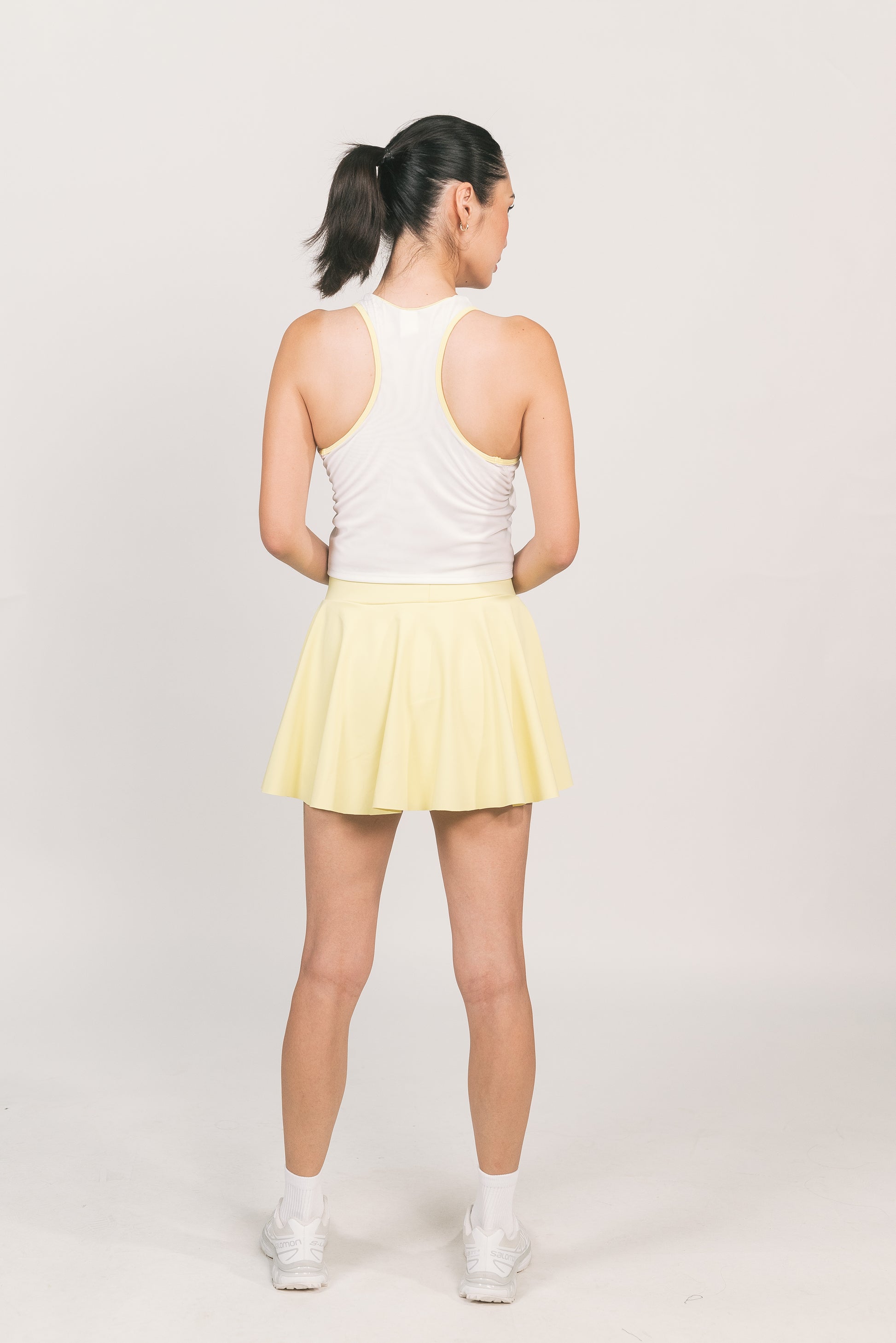 STYLE: Mini skort with built-in shorts.