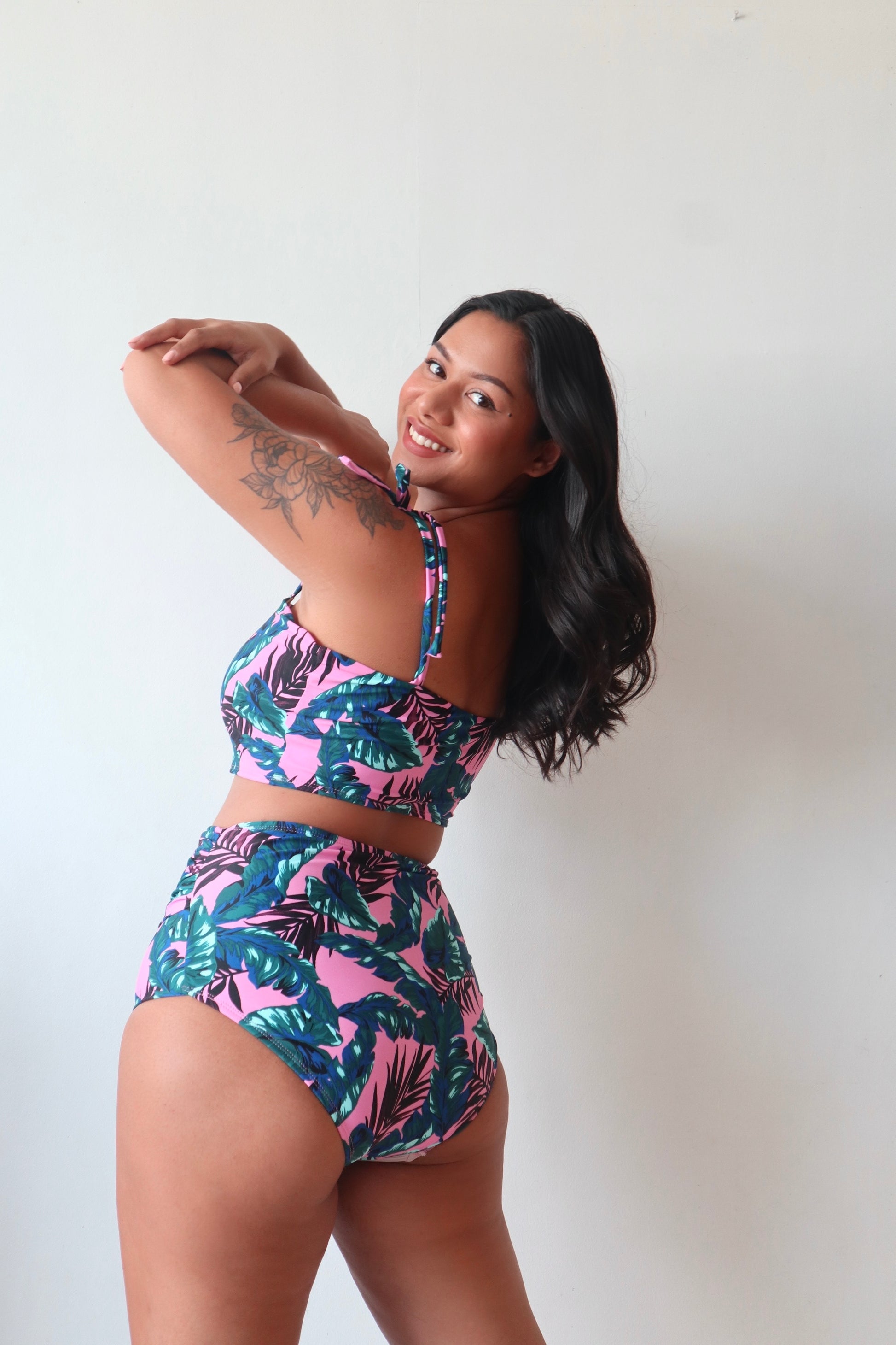 STYLE: 2-piece swimsuit with shoulder ties and ruched high-waist bottom